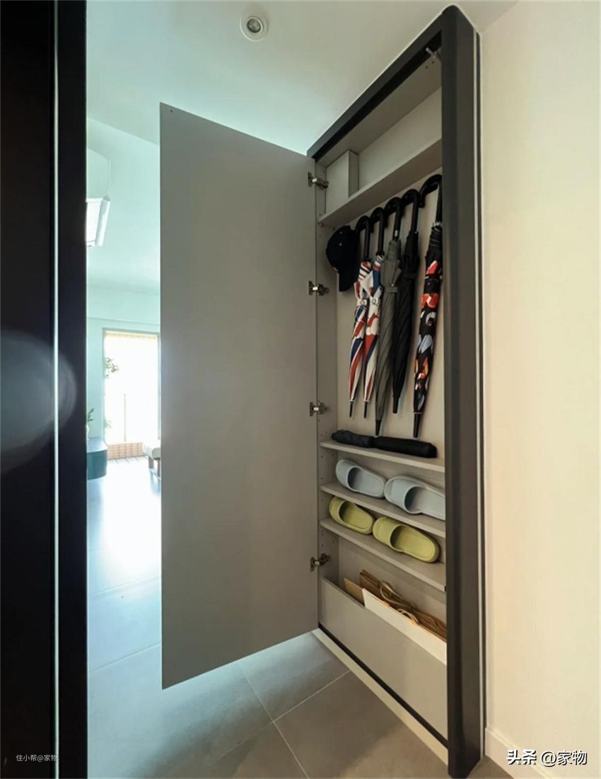 门后15CM(大概两指之间的距离)打薄柜,虽然空间不算大,但收纳零散的日用品绰绰有余。比如在卧室门后空隙处就足够做一个窄柜,收纳薄衣服、鞋子、帽子围巾领带等饰物刚好。
