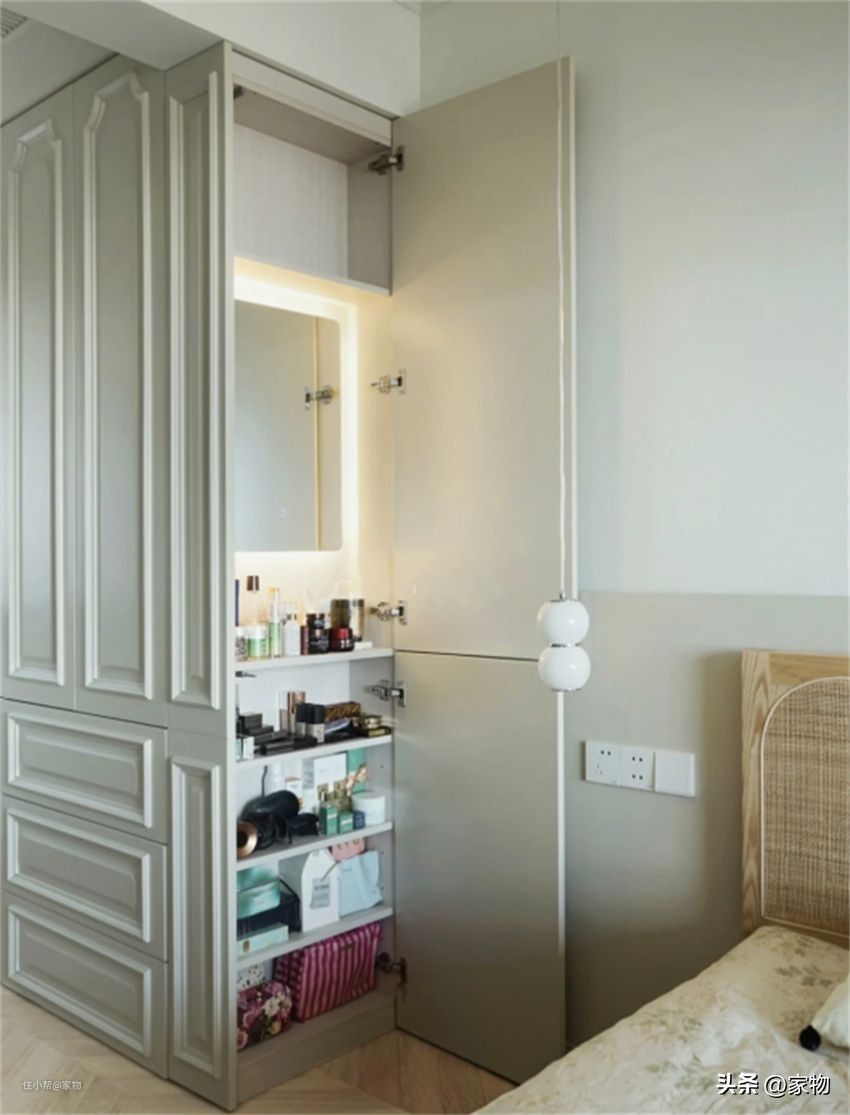 存放化妆品、日用品好用又方便找。空间足够还能在柜内加一面镜子,作为独立的化妆台也很不错。