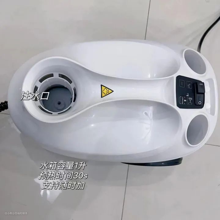 在主机底部也搭配了万向轮,便于机身移动(虽然也不重)。注水口在机身上方一侧。水箱容积有1L,还支持随时加水,预热时间30秒,炉内加热温度170℃,加热功率1750W,高效清洁就是这样环环相扣!另外,可以使用自来水也是非常方便了~