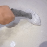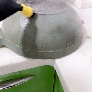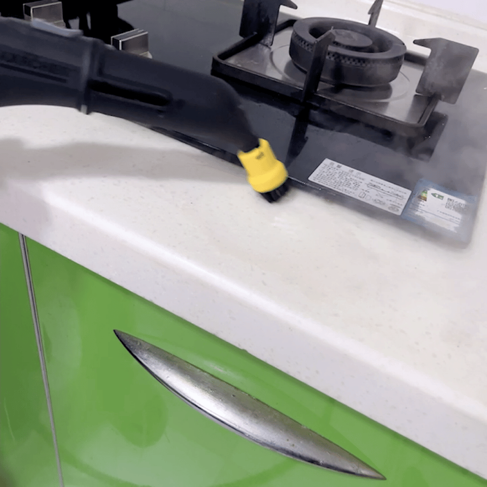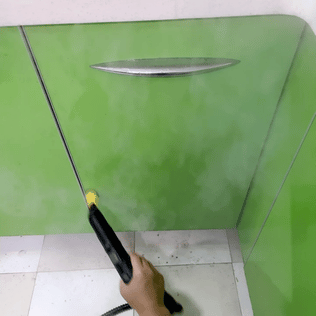 换上套上毛巾套的手持刷,用高温蒸汽清洁整个灶台表面和墙面,细腻的高温蒸汽配合微纤维的摩擦使得本就残留无几的油污瞬间一扫而光,油烟克星是也。