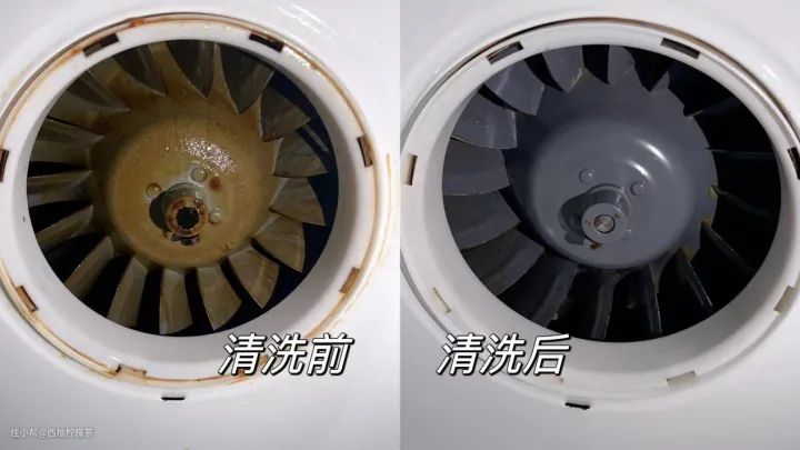 再转头来看看抽油烟风扇的清洗对比图,虽然说不上达到一尘不染的程度吧,即使还沾有零星油渍,但至少「浅喷」之后已经这样了,要什么自行车!