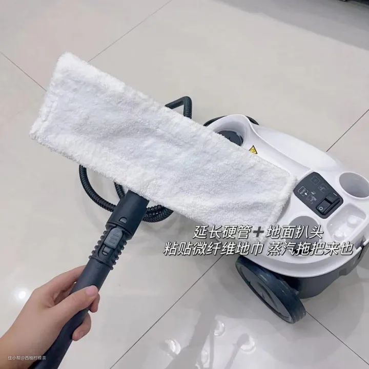 延长硬管配上地面扒头,粘上微纤维地巾,摇身一变蒸汽拖把,可以对地面进行日常的高温清洁,干净整洁的同时顺便消毒除菌,一举两得。