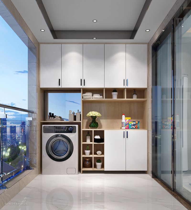 ▲如图,如果自家的阳台比较小,只能放下一个洗衣机的位置,就可以设置一个收纳柜,上边烘干机,下边洗衣机。如果自家的阳台比较大,则可以洗衣机和烘干机放下边,上面是收纳柜,可以洗好衣服烘干后就叠好放置在柜子里,省时省力,即使回南天也不用担心衣服干了又湿的发霉了。