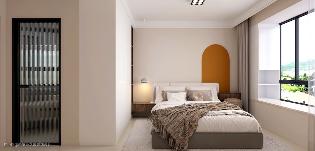 卧室主要是以休息为主,整体没有使用太过复杂的元素,床头加上线性吊灯作为装饰,让整个空间处于以一个惬意温馨的氛围。