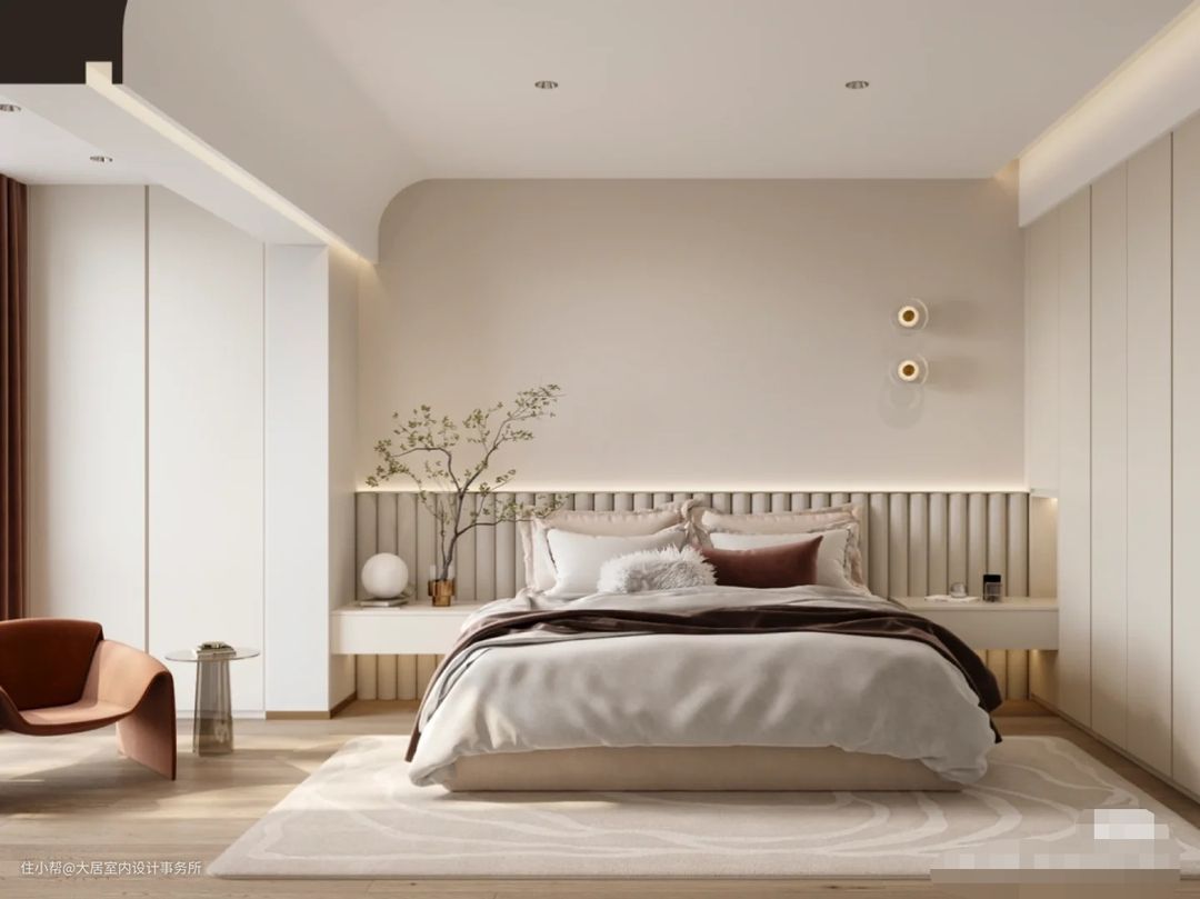 木制结构糅合进简净的空间,主卧的设计也极尽自然舒适。床头以木纹作为背景装饰,温馨的原木纹理营造出十分协调惬意的视觉呈现,可在一定程度上提升主人的睡眠质量。