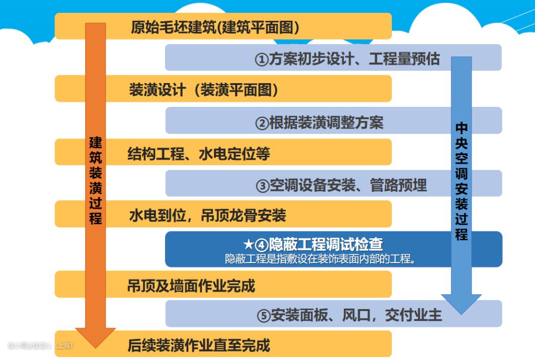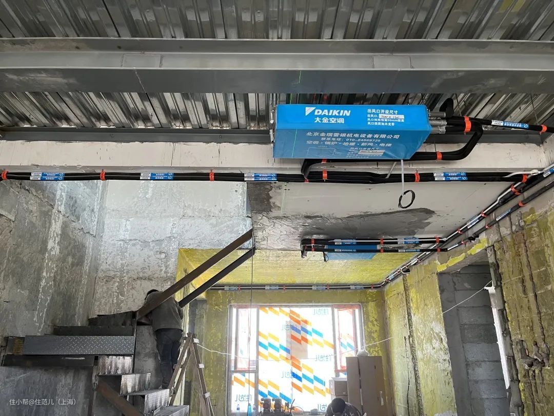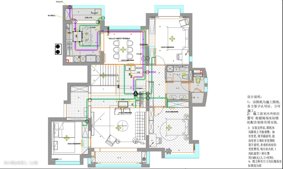 基本要在水电、吊顶之前就需要把中央空调的方案定下来,确定后有严格的走线方式,包括打孔、高度的图注。