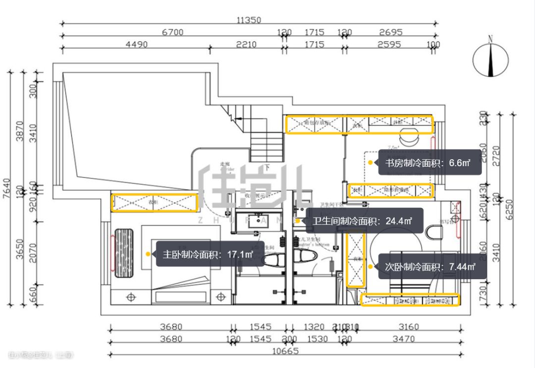 一共四个空间,主卧、次卧、书房、卫生间四个内机(均按照制热需求220w/㎡配置)。
