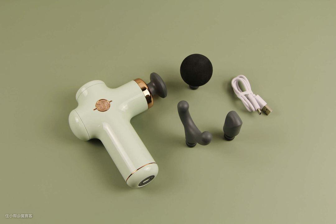 ▲晒下全家福:筋膜枪本体、6个按摩头、TYPE-C充电线、说明书/三包卡。