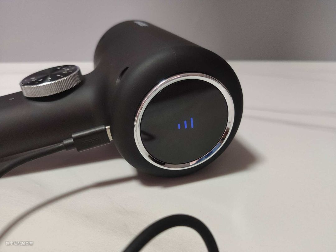 ▲筋膜枪尾部为电量/档位显示屏,在显示屏下方则是TYPE-C的充电口。
