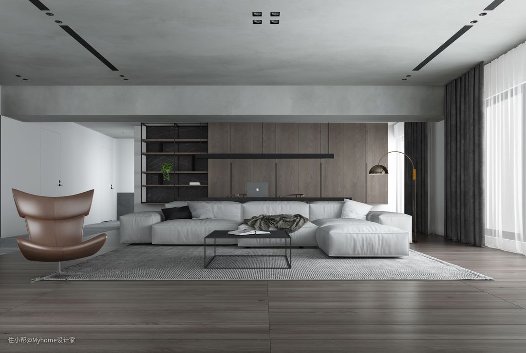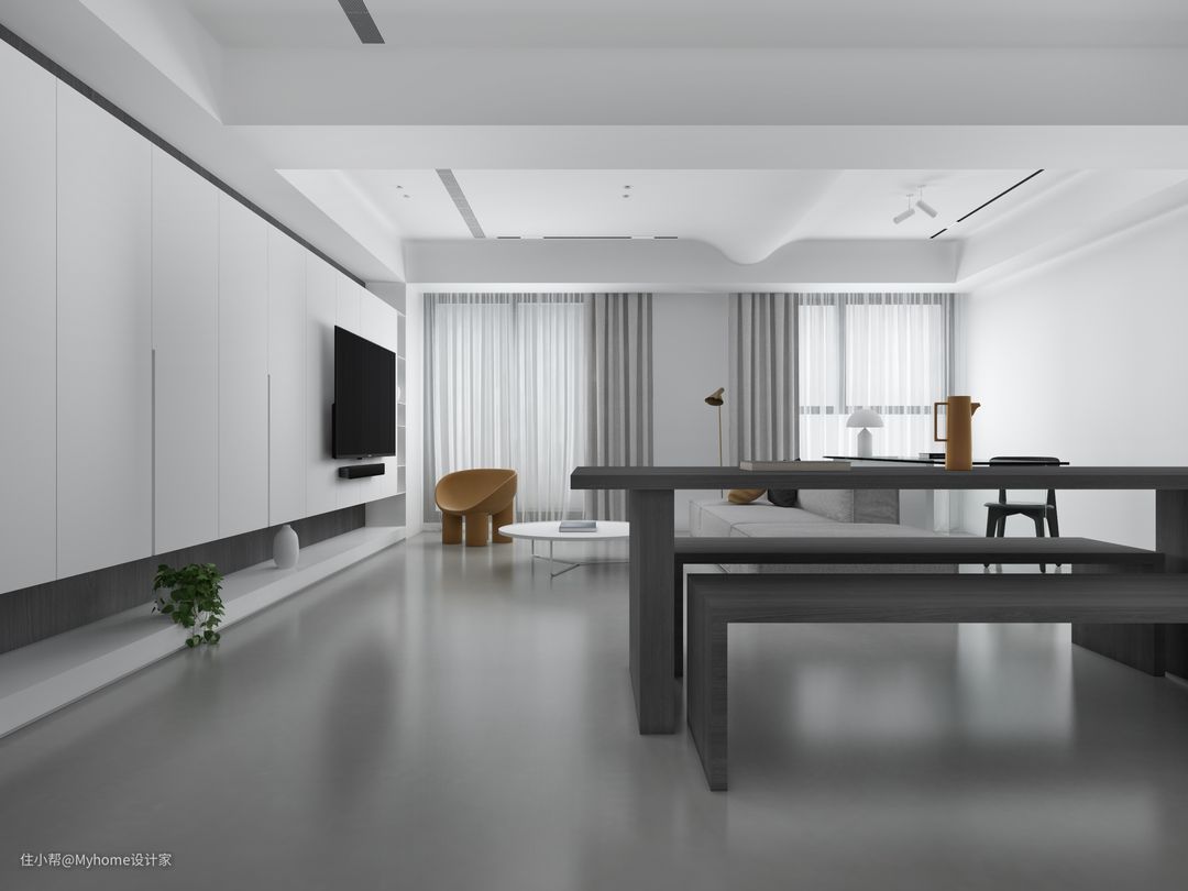 「生活因极简而无拘,人生因留白而无束。」新成屋以黑白灰作为空间基调,天花板与墙壁大面积的白提亮空间,灰色无接缝地坪垂直延展空间尺度;沙发的浅灰、书桌的洁白与深木餐桌配置,是透过家具色块作为场域分野的现代设计手法。