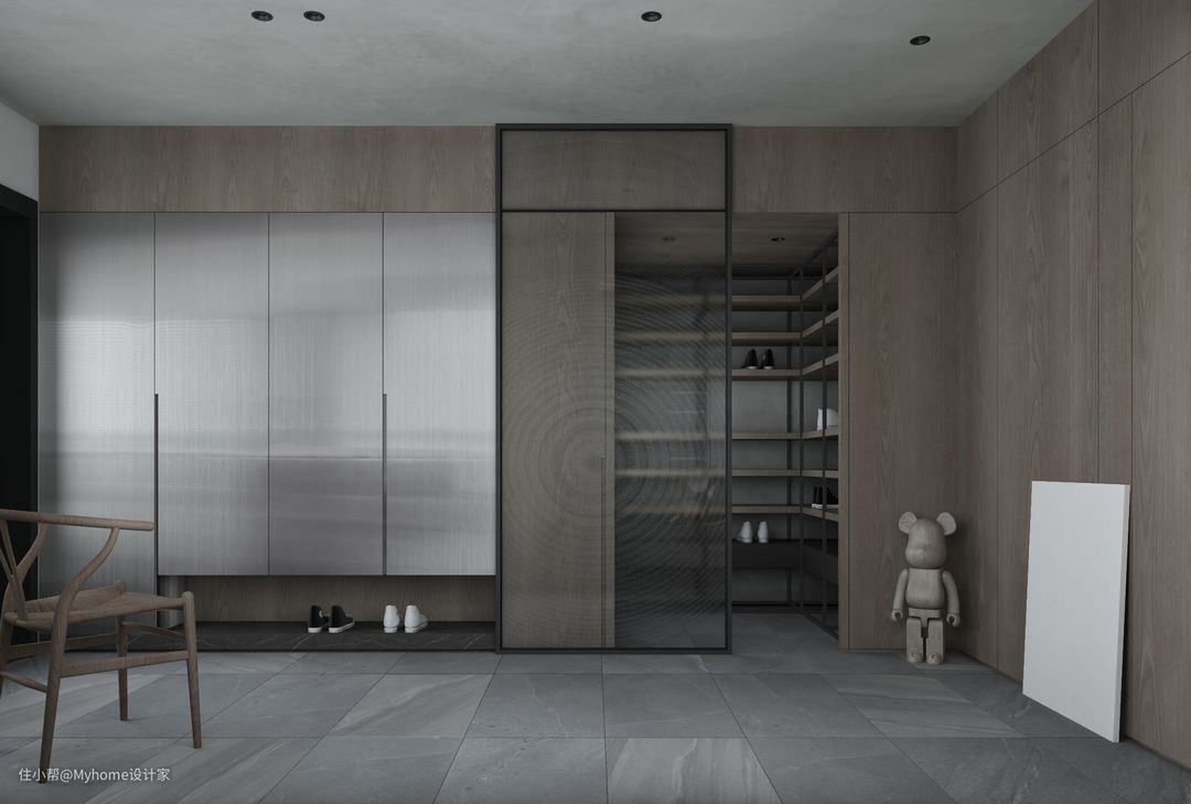 为提供一家五口生活的收纳需求,天沐设计将两种鞋柜机能置于同一个平面,透过异材质衔接降低切割性,玻璃拉门后方是walk-in 储藏空间,不锈钢悬浮收纳柜则用来放置常用的物品,保留电视主墙的简约设计。客厅开放式书柜同样以悬浮设计,即便长度与墙面切整也不显压迫,与沙发尺度均衡让降低收纳量体的存在感。