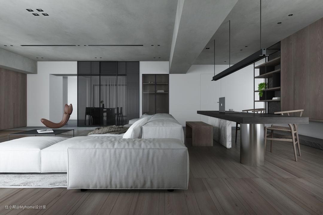 客厅的门片皆为隐藏式设计营造整体开阔的视觉,开放式空间中植入白色中岛,利用线性与块状几何分割机能区域。