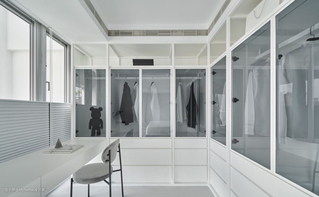 跳脱以大理石和镀钛金属等建材作为豪宅基底的概念,选择最纯粹的白包覆天花与立面,墙面大面积留白与柜体白色烤漆相连,给予空间纯粹简洁的视觉感受。