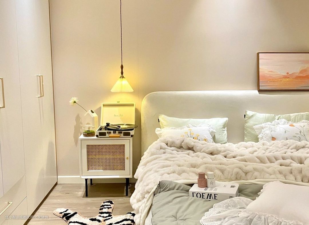 1.8*2.0的奶白色皮床,清洁方便,靠背的造型有点法式风格,不会太厚不占地方,看起来是十足的温柔风~