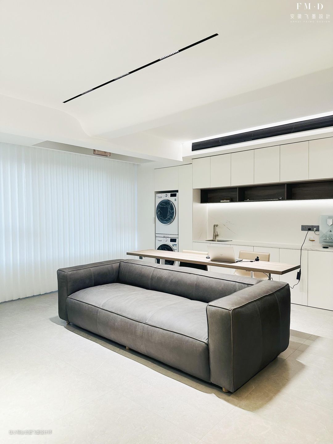 其实就是一排2米2长桌,往三人座沙发后一放,就多个开放式书房啦,在这办公、阅读,或者把这当成休闲吧台,功能性不要太多!累的时候,就抬头看下电视放松下,对身心都有好处。甚至还能取代茶几功能,像是手机、茶杯、遥控器等,往后随便一放就成,是不是很方便?