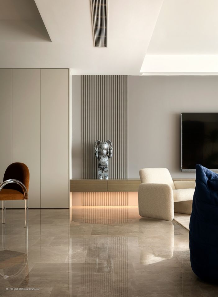 电视背景墙涂刷雅灰色乳胶漆,局部用同色格栅做出造型的层次感,悬挑的抽屉柜补充部分收纳功能,底部暗藏灯带增加空间的轻盈感。