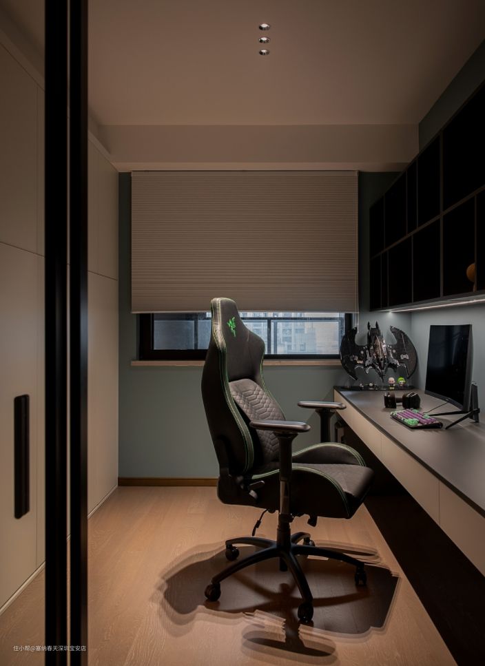 朝北的次卧室改为多功能房,原本的平开门拆除,连同墙体也一起拆除,换成透光性更好的玻璃推拉门,解决走廊采光不足的问题。这里平时作为男主人的书房,也是放松休闲的电竞房。定制柜内隐藏了墨菲床,偶尔来人需要居住时又可以作为临时客房,实现一房多用。