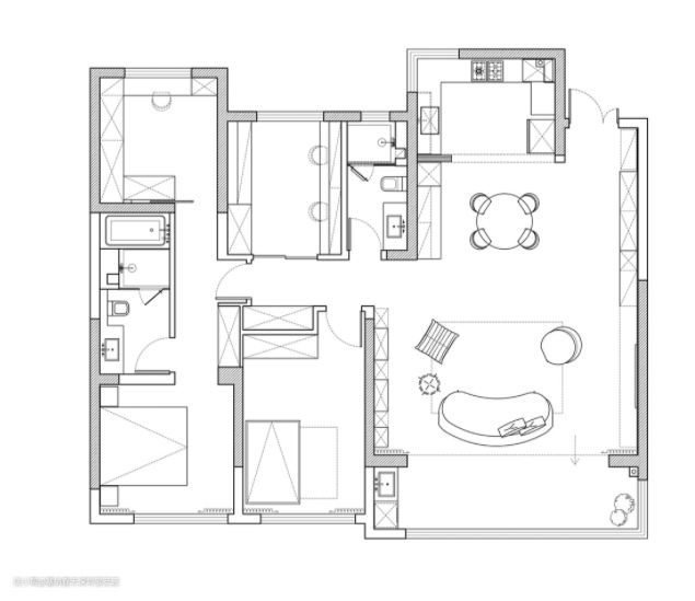 原始户型南北通透、动静分离、开阔舒适、布局合理,完全满足不同结构家庭的居住需要。但仍有一些小瑕疵,比如:厨房采光位置特殊,造成餐厨空间采光不足;精装交付千篇一律的设计毫无个性化可言;交付时配套的柜子和房门样式比较传统。