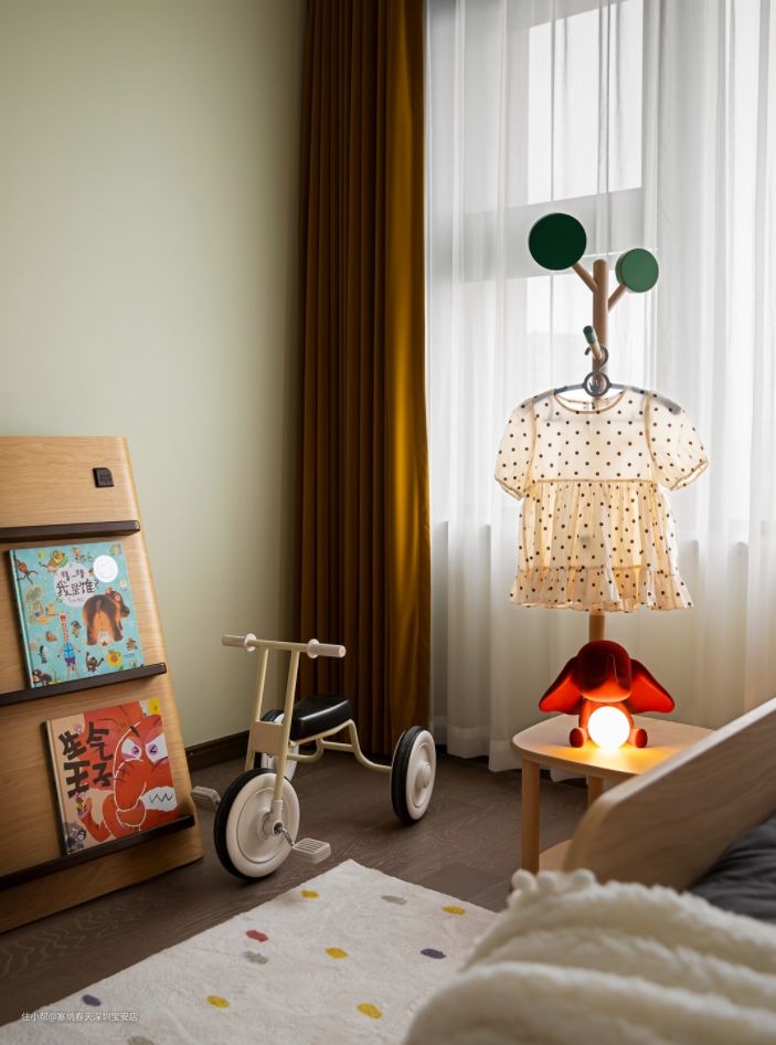 朝南的小房间作为儿童房,以孩子更喜欢的鲜亮色调为主,整体的布置温柔甜美,卡通的元素充满童真和趣味。