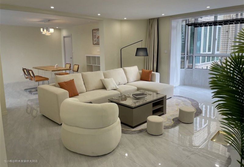 在客餐厅的硬装上,以瓷砖做了通铺处理,视觉上更加显大;