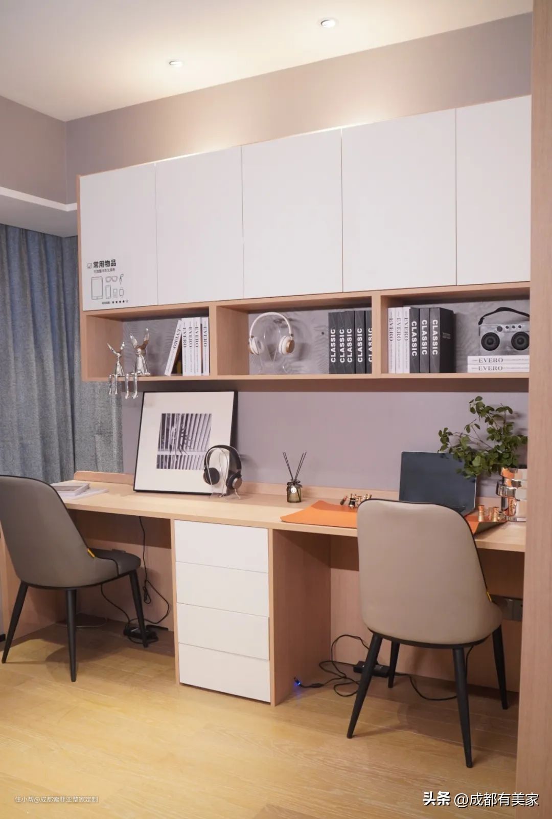 为了让两个孩子有良好的学习环境,将一间卧室改成了书房,定制了两个座位的书桌,定制柜整体以暖色为主,原木色柜体搭配白色柜门,给人安静舒适的感觉。