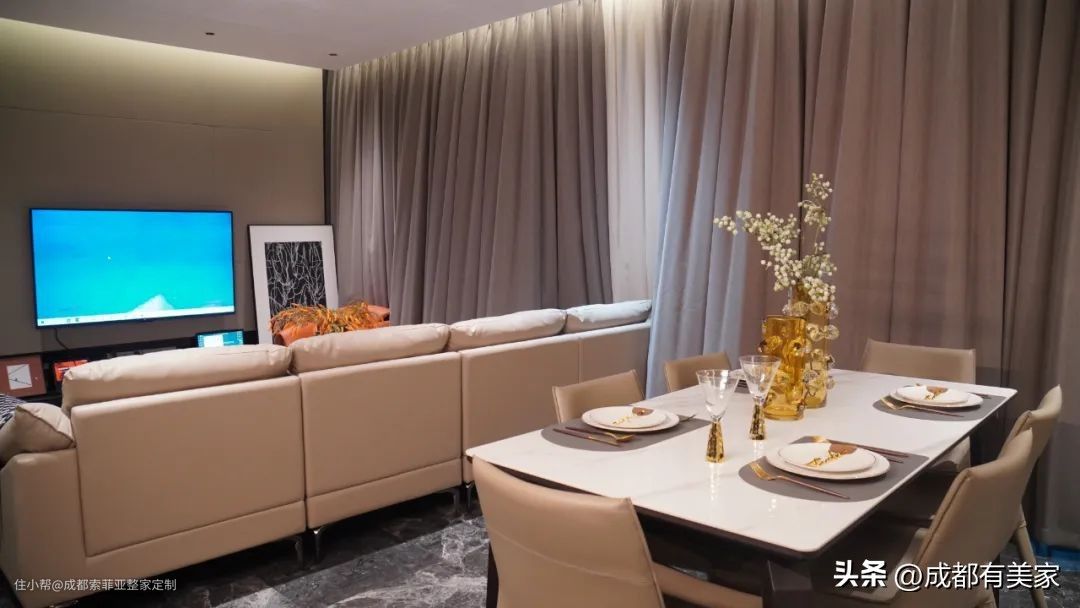 客餐厅之间未做隔断,一体化的横厅布局,带来超宽的采光面和观景面,让空间更加显得开阔通透。