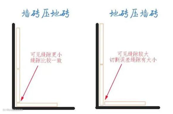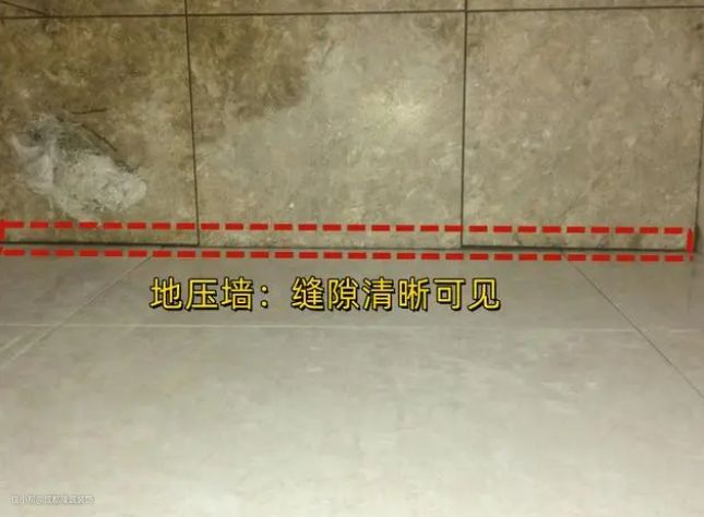 所谓的“墙压地”就是墙砖压地砖,是指在卫生间贴墙砖时,最底下一排的砖位先空留着,从倒数第二排的墙砖开始铺贴,等到地砖全部贴完之后,再把最底下一排墙砖铺贴好,这时墙砖正好可以压在地砖上面。