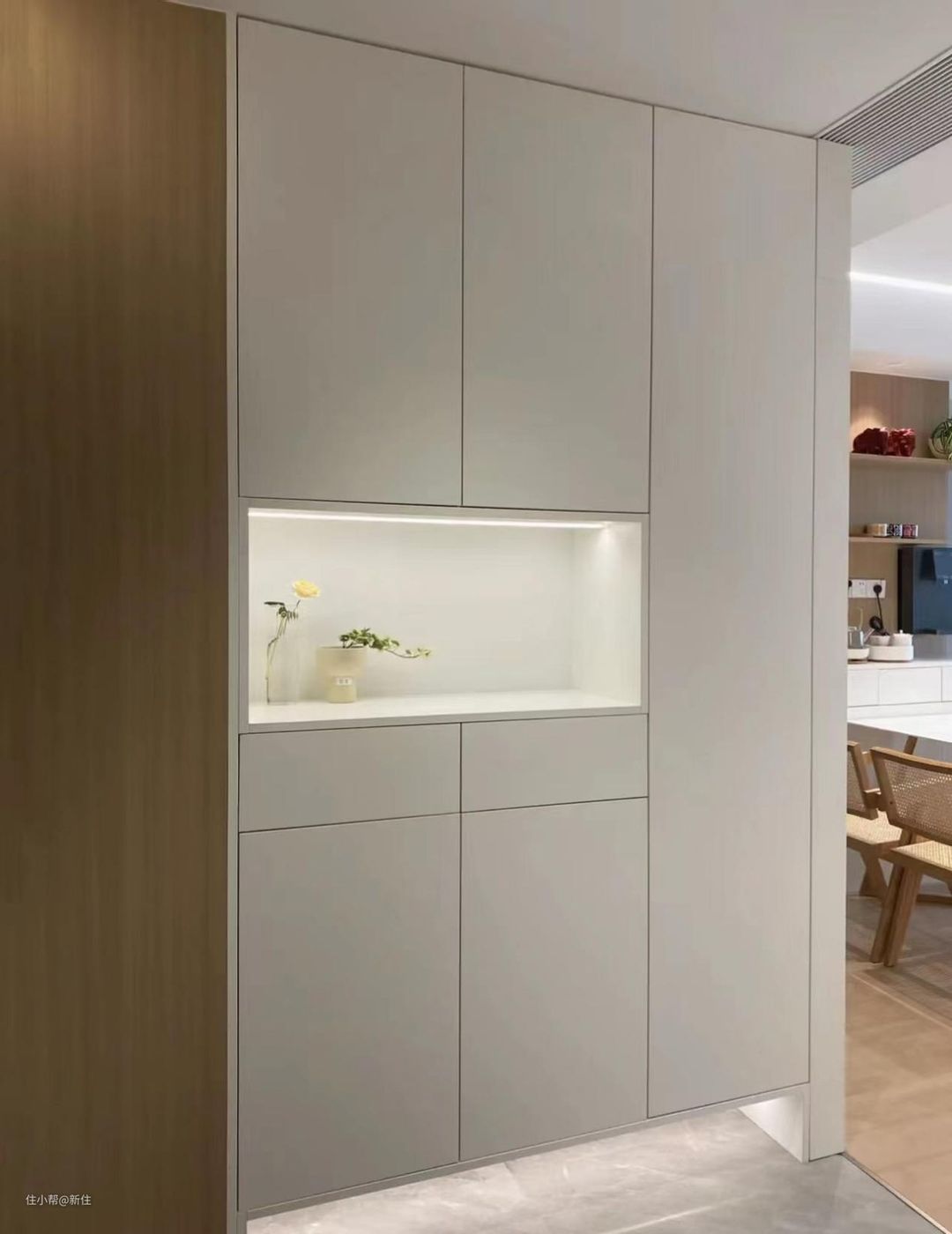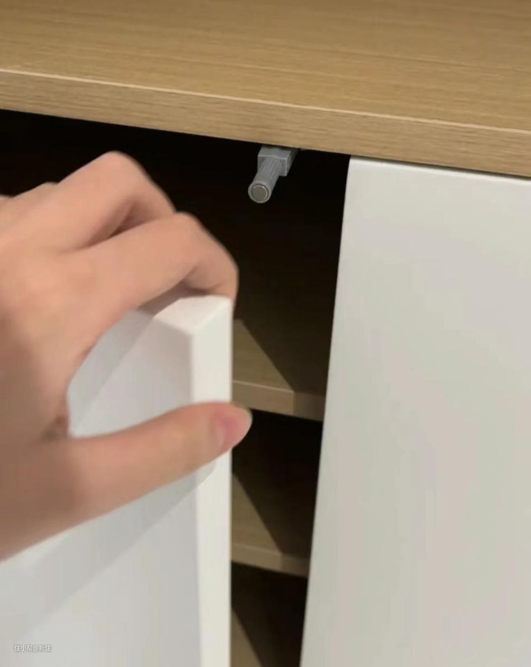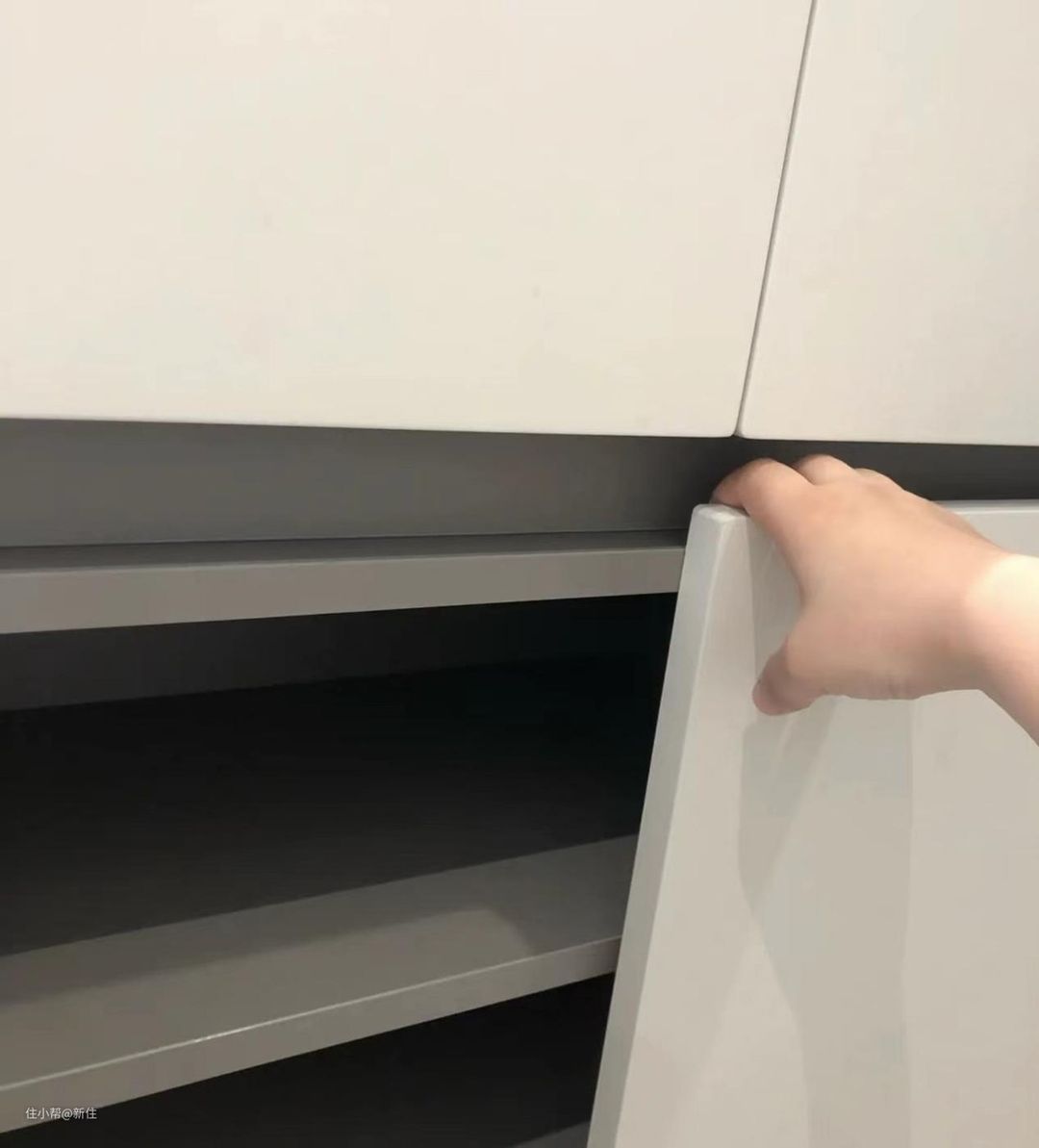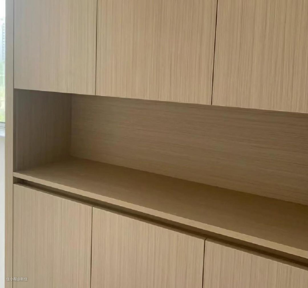 其实完全可以像周周巷子家学习,侧面压住中空格的见光板,平时开门就用手指拨开,然后把这个柜子,用来放一些不常用的东西即可。