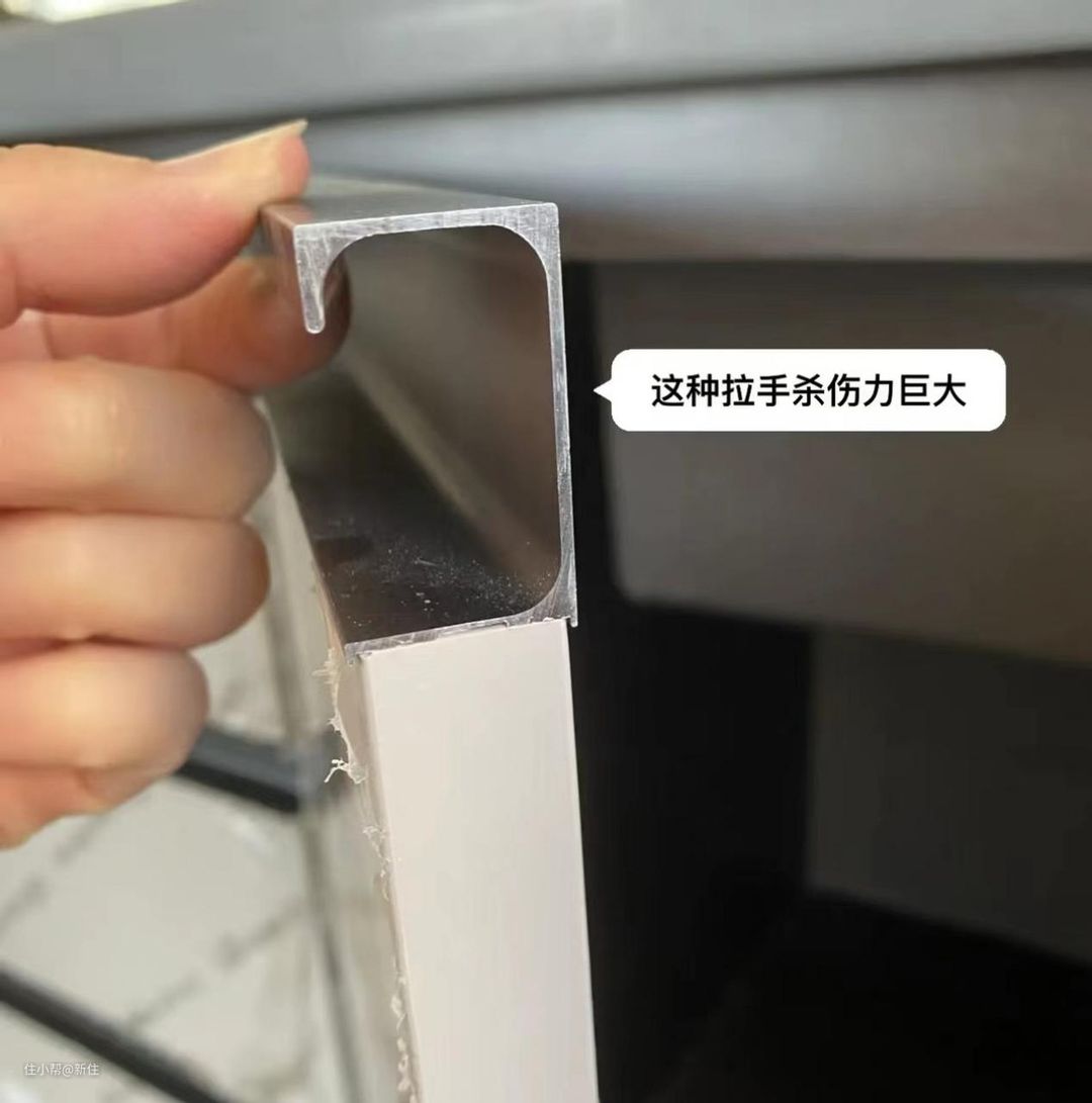 割手、刺手的拉手:劣质的拉手,常见这种情况。还有就是许多定制商家,不太讲究,做所谓的G型隐形拉手、7型隐形拉手,但拉手两侧,没有做封盖,也会割手。