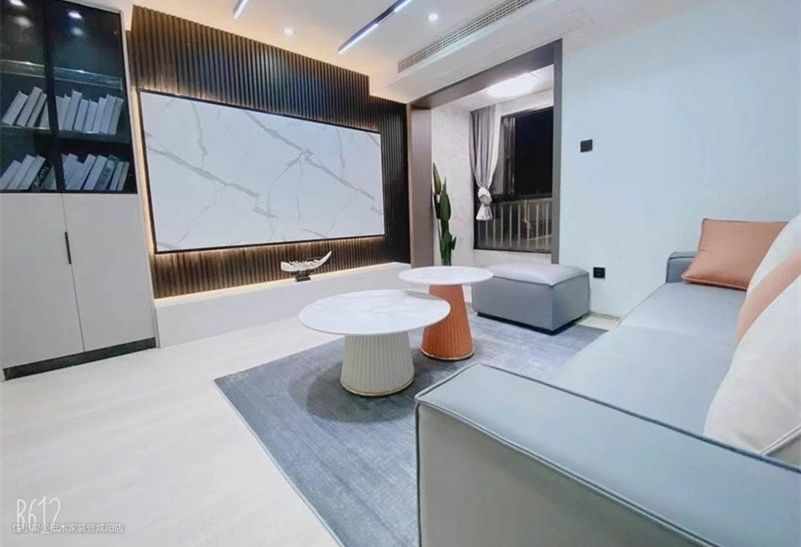 木栅格+岩板的背景墙,在客厅有现代高级感;整体留白设计,让空间看起来大了不止一点;