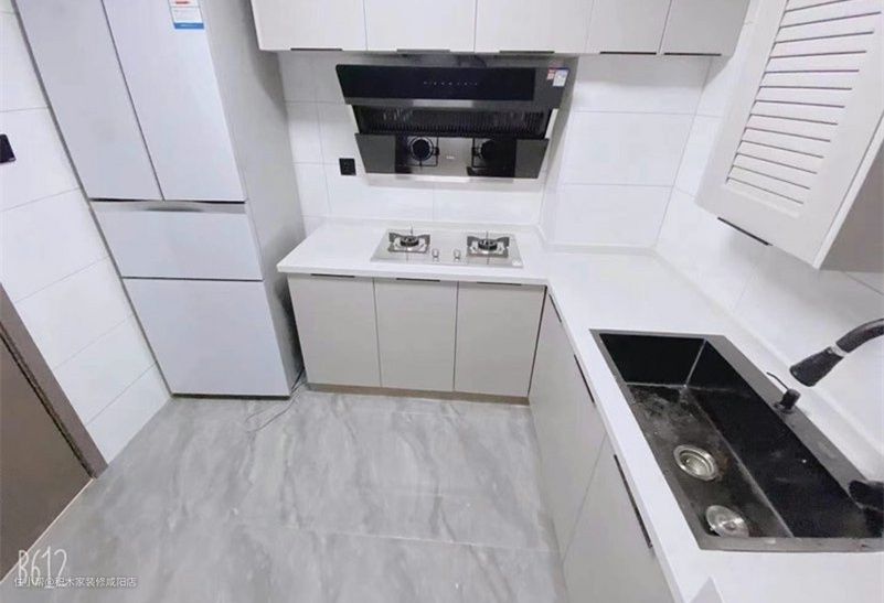 厨房使用了L形的橱柜,旁边做了断点设计,预留出冰箱位;大单盆设计更加方便使用;