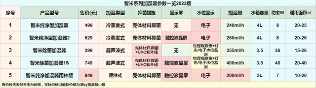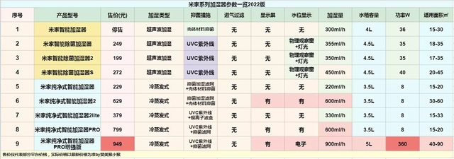 通过以上米家系列加湿器的参数对比,可以看到目前米家系列加湿器品超声波与冷蒸发式产品数量各占据了一半,其中超声波式加湿器的三款机型性价比都十分不错,参数之间差别不大,最贵的S版与2之间仅相差80元,加湿量相差100ml/h。