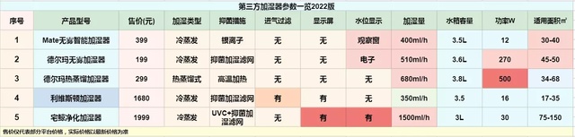 以上第三方品牌加湿器的参数跨度区间较大,从350ml/h-1500ml/h区间,价格从199-1999元价格区间,种类上主要以蒸发式加湿器为主,配置性价比上总体不如米家和智米系列。