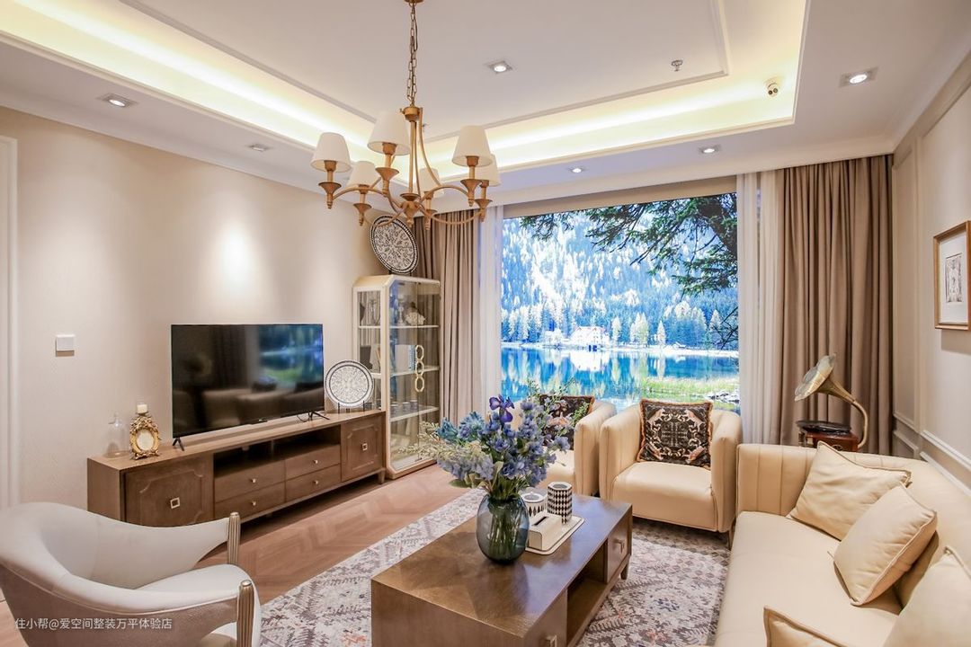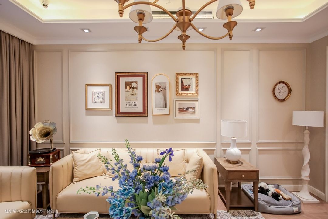美式风格背景墙,强调线条感,全屋乳胶漆颜色选择了一个温柔的奶茶色,是一个超级温柔的颜色,用墙面空间渲染出轻奢浪漫的气息,大气优雅。