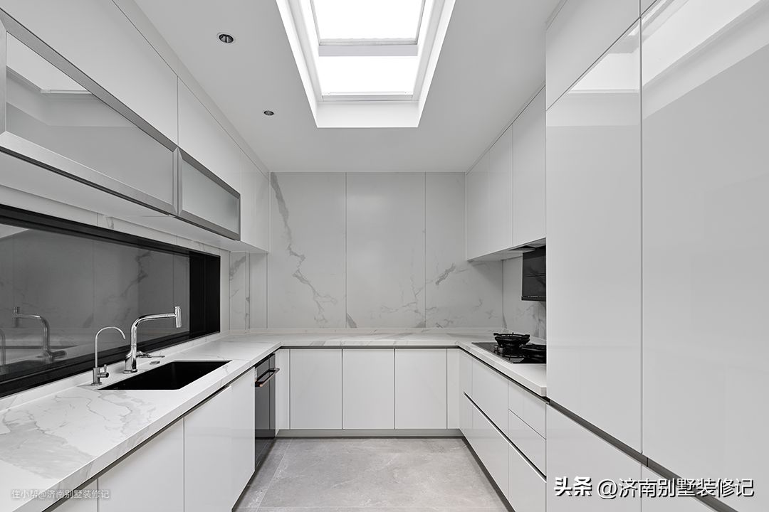 整个厨房以白色调为主,与洁白的墙面融为一体,看上去干净又明亮,满满的高级感,无拉手的设计整洁清爽,高柜的丰富了收纳形式,满足各类厨房用具的收纳需求。