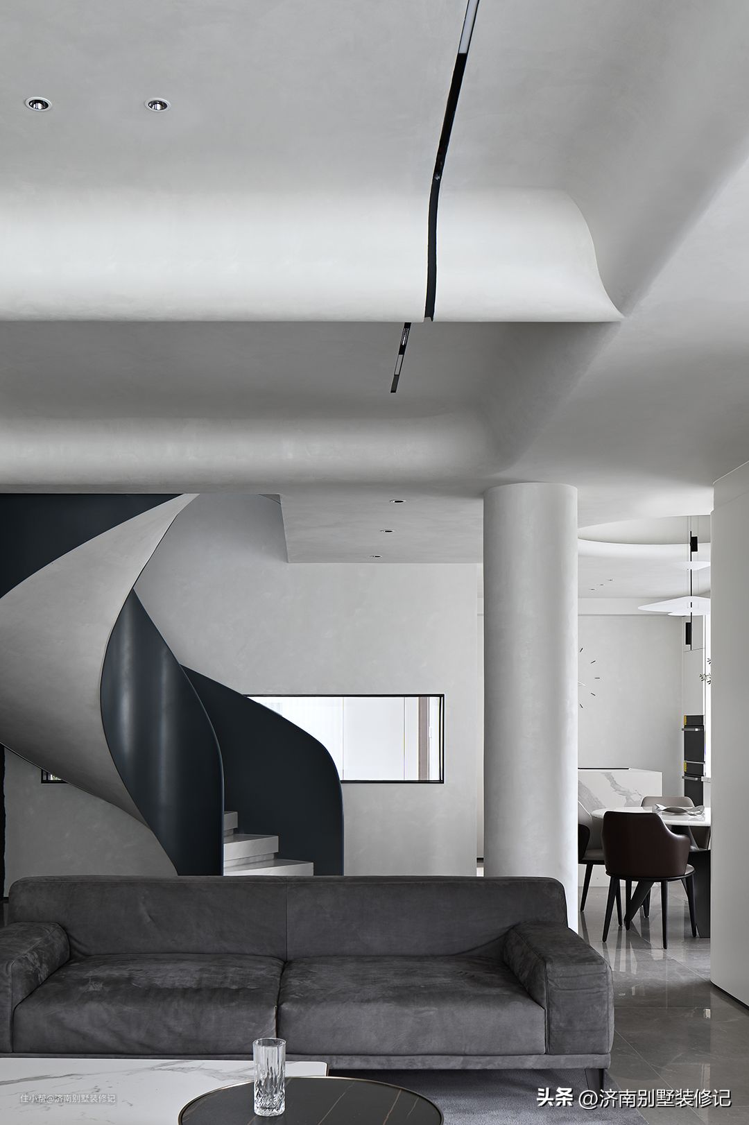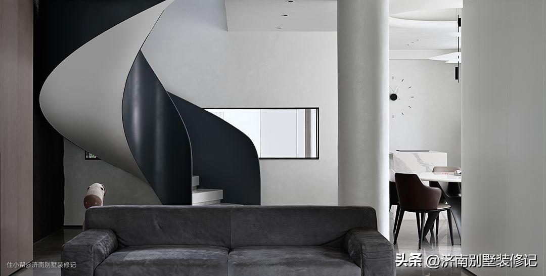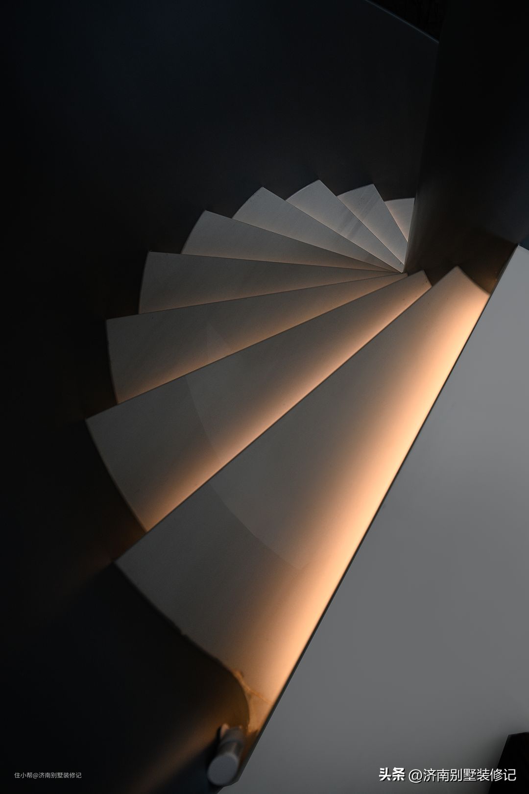 楼梯采用旋转式楼梯,蜿蜒向上的线条感十足,在光线下形成的光影也别具美感,自带艺术属性。