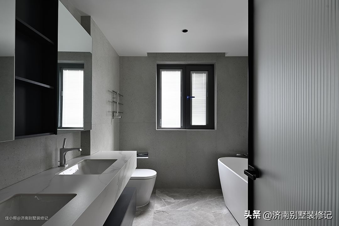 洗手台是卫生间的灵魂,双台盆的设计更方便使用,无主灯的设计,独立式浴缸仿佛艺术品一般,躺下去拥有被水拥抱的温暖,让身体舒缓下来。