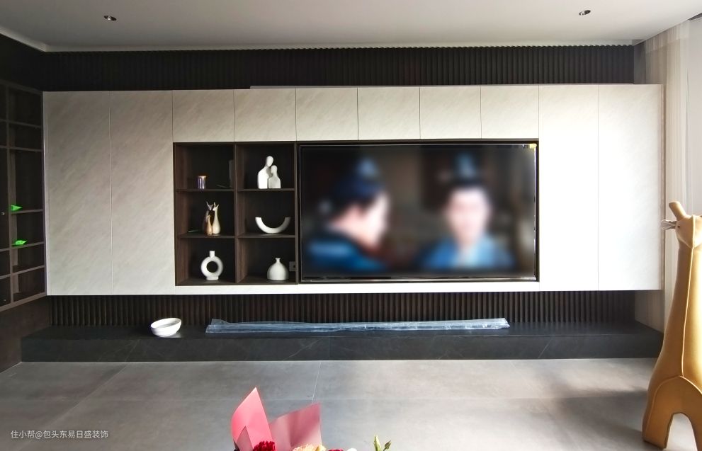 电视位预留正方形同样也会增加空间厚重感,正确做法是预留长方形位置,可以拉伸空间效果,电视位一侧选择做开放格,摆件可以提升家里的精致感。