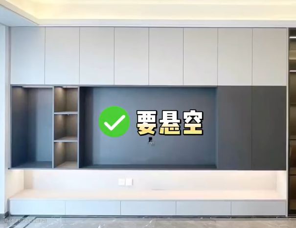电视柜侧板外露,会让人清晰的看出柜体厚度,更会产生厚重感,正确做法是在柜体外侧砌假墙,营造出柜体嵌入感。