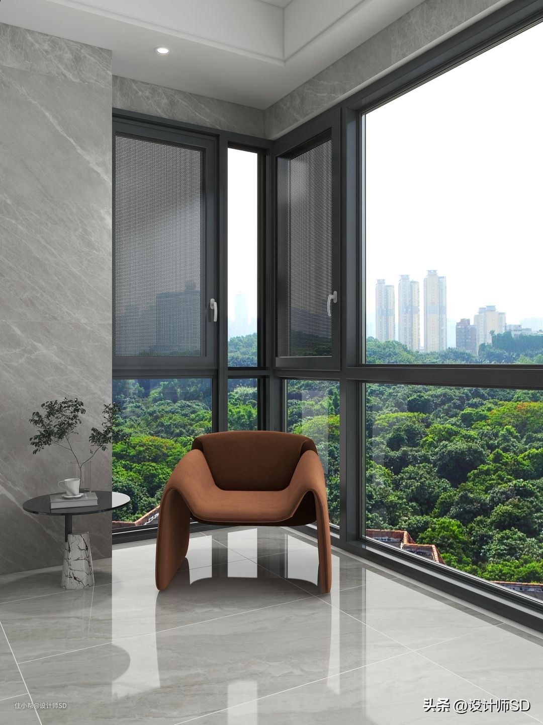 阳台的窗户做了断桥的封闭,所以阳台的空间与客厅成为一体,中间的门洞则是实用黑色的拉丝钛金作为门套垭口,看上去很有精致感。地面的瓷砖是从客餐厅通铺过来的,搭配粗狂纹路的墙面砖。整个阳台的通风采光使得客餐厅也会更为舒适。