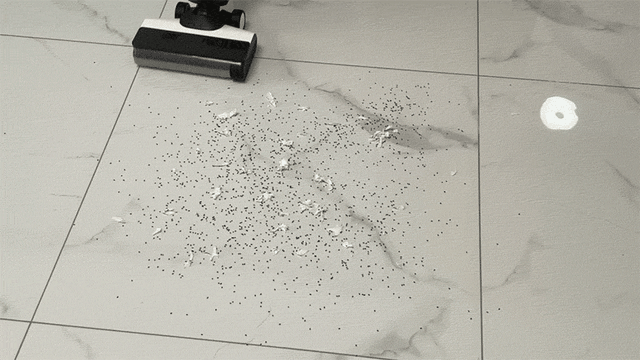 如动图所示,每个地方只需要吸一次就完全吸干净了。而且洗地机拉回时在地面上也没有残留的纸巾、芝麻,都被吸到洗地机里了。单滚刷不仅能完成清洁任务,而且表现很好。