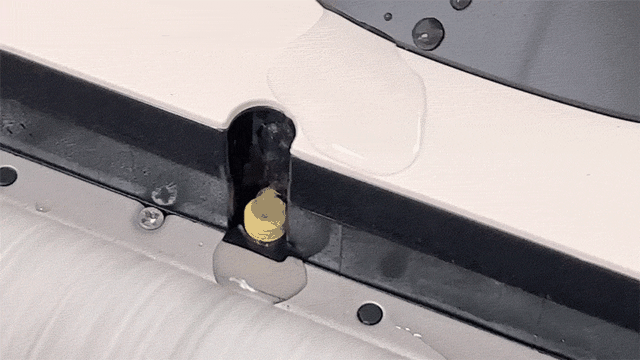 当滚刷接触地面完成清洁(将地面上的灰擦掉或把污水带走),滚刷上的污水(被地面弄脏的)会被顶部的金属刮条刮掉,然后被强大吸力吸到污水箱里。同时,黄色喷头会继续喷出清水,通过盖板再次均匀的喷在滚刷上,相当于马上就对滚刷进行了“自清洁”。然后再将脏水吸走,再喷清水……如此往复。