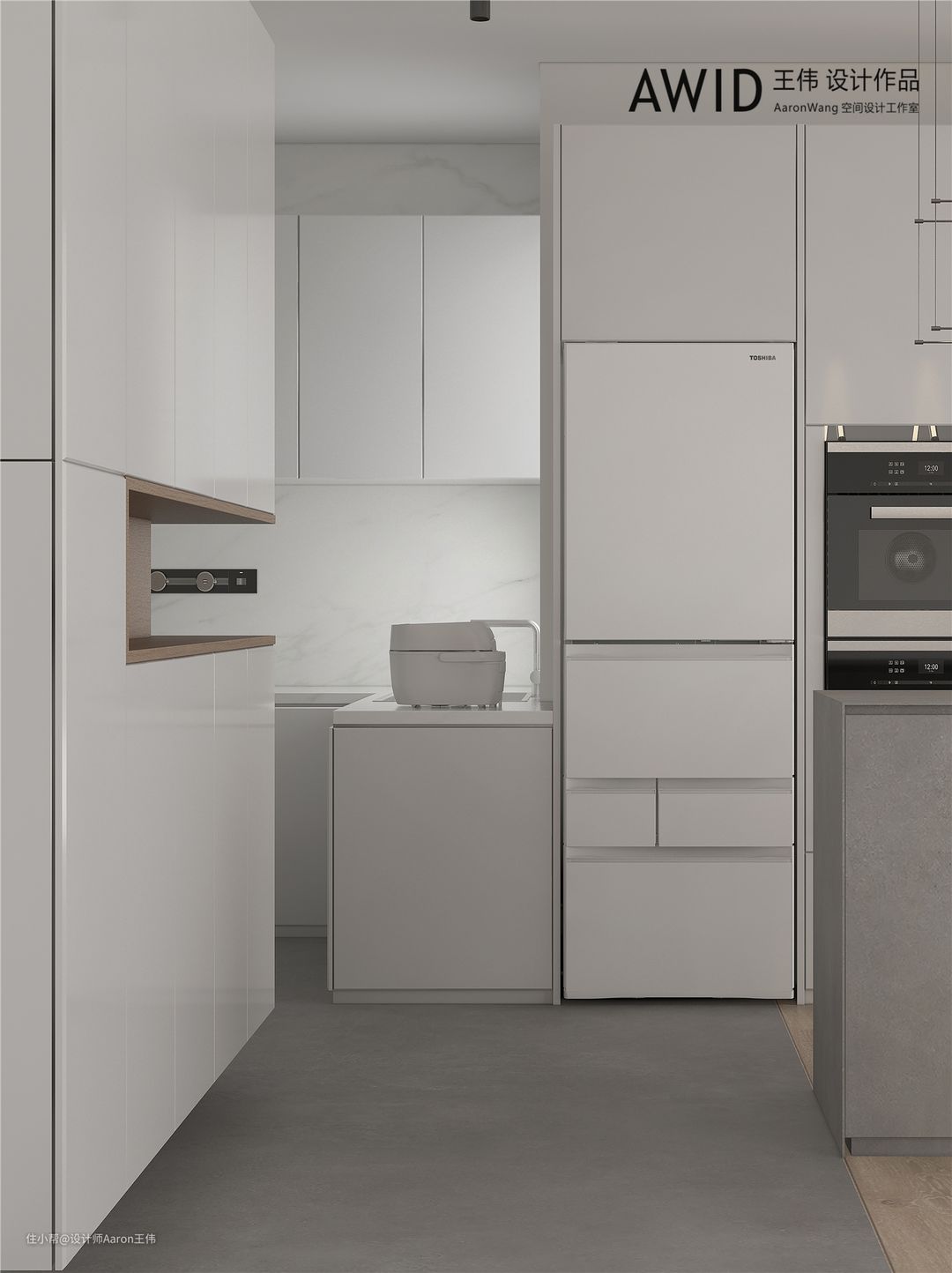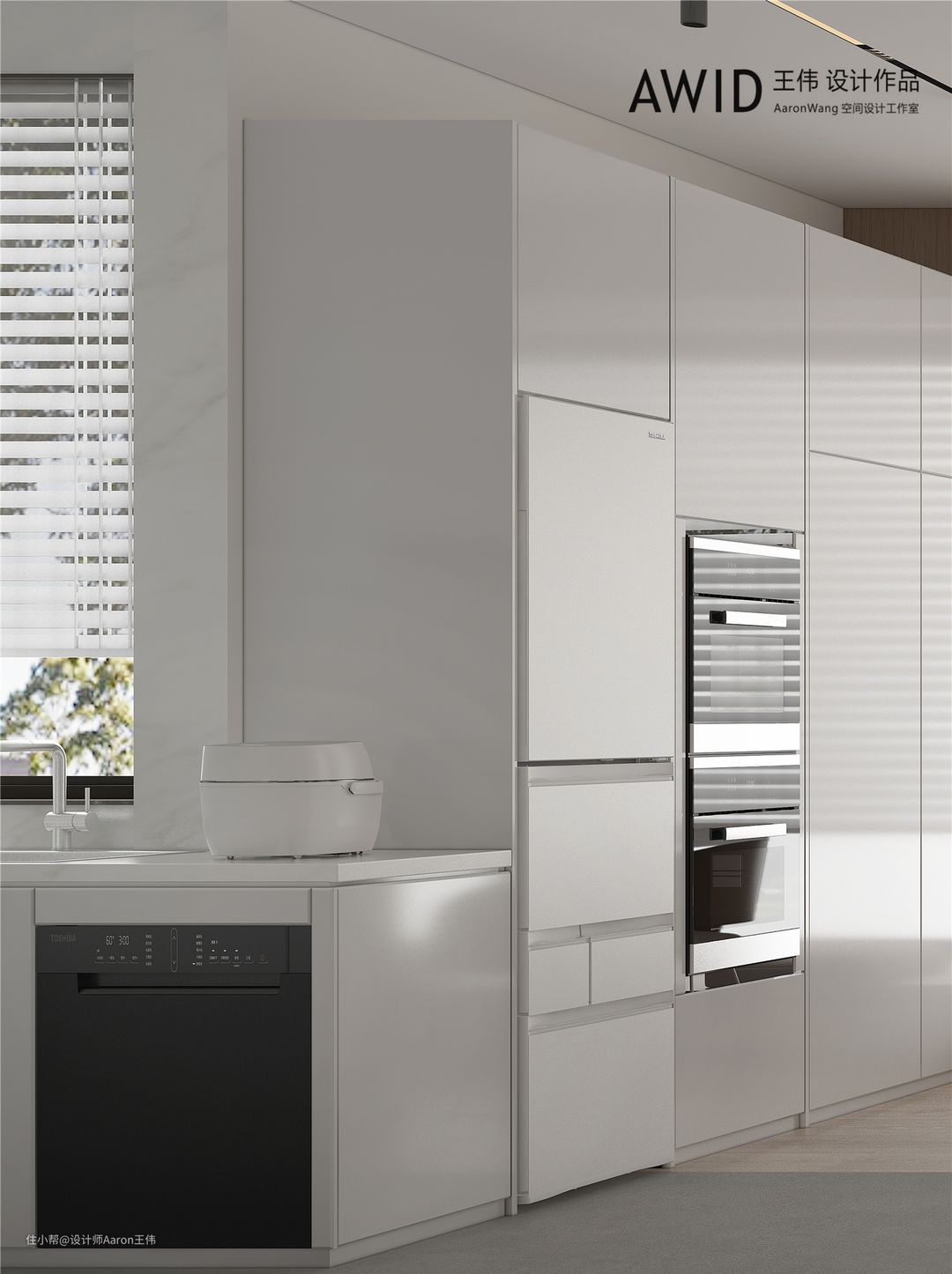 白色的柜子具有很强的视觉收缩感,既弱化了柜体的体量感,又能和墙壁融为了一体,让空间显得更加开阔。为了不打破这个视觉效果,对于冰箱的选择就尤为重要了。