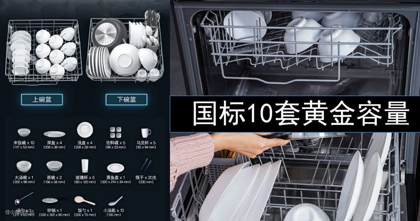 10套:这个可以说是黄金容量,可以满足大部分三口之家使用,碗盘、常见锅具都能洗。