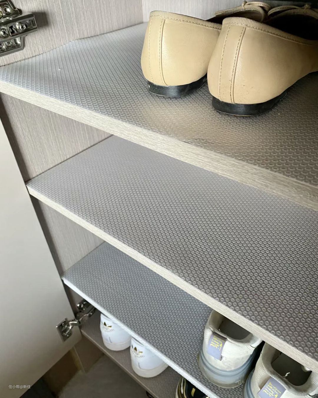 无论家里层板是否怼住背板,都建议给层板上铺上波点垫,不仅方便鞋底的土、脏污清洁,还能防水,下雨天鞋子鞋底有水,也能直接放进鞋柜,不怕弄坏柜子。