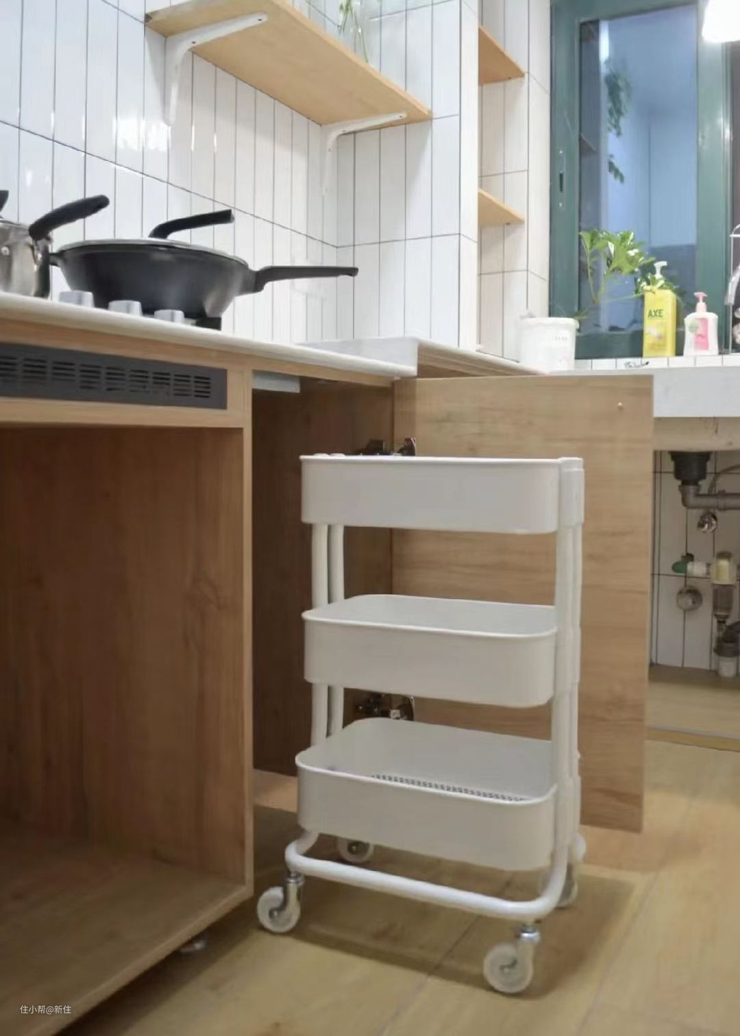 非常好用的小推车,可以安排进柜门内,关上门清爽爽。