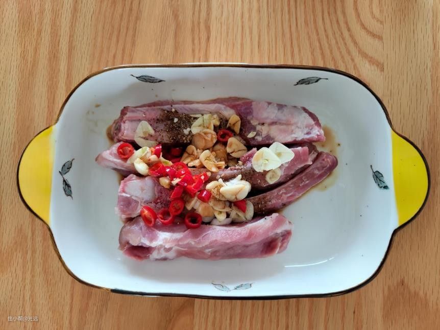 做法非常简单,将新鲜的肋排洗净,用葱、蒜、胡椒粉、酱油、小米辣腌制半小时。