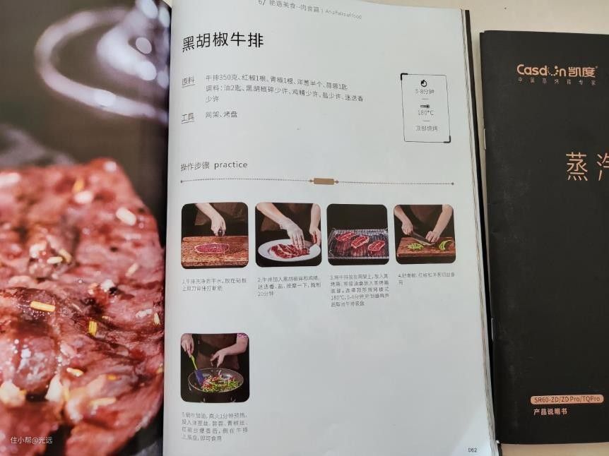 值得一提的是这个菜谱,里面做菜的各个步骤都很详细,完全可以根据菜谱复刻出对应的菜肴来,比如这个黑胡椒牛排,菜谱写得就很清楚。