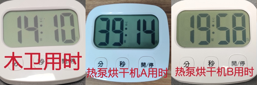 选用程序:木卫C1小型烘干机为时长15min的闪烘模式;热泵烘干机A为时长40min的快速烘模式;热泵烘干机B为时长20min的快速烘模式。