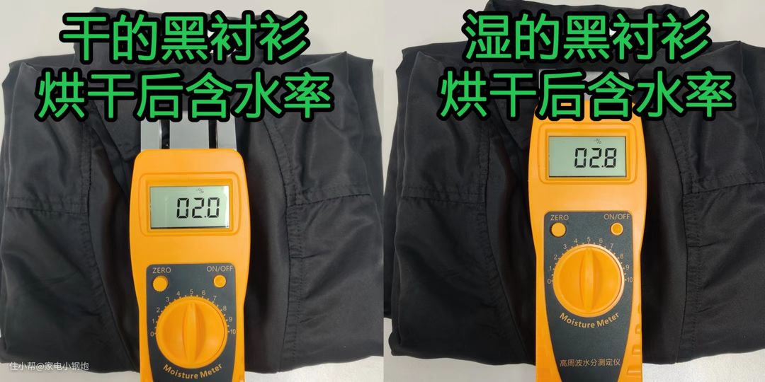 含水率测试小结:在单件衣物的测试中,白T恤烘干后含水率最低的是木卫烘干机,含水率为2.4%;